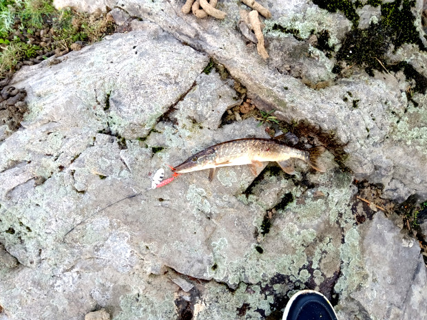 Gefischt habe ich vom Ufer aus. Den Hecht habe ich wieder ins Gewässer zurückgesetzt (catch & release). Spinnen Åsnen Jig / Soft Bait (Schwanz / Grub) | |