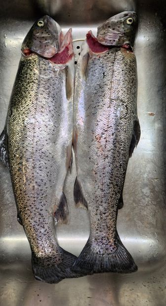 • 2 Fische Regenbogenforelle  auf ingesamt 1.7 kg, Durchschnittsgewicht 0.87 kg.  "Ein Bogen wiegt 891 g, der andere 858 g."