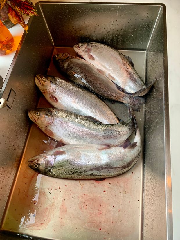 • 5 Fische Regenbogenforelle  auf ingesamt 5.0 kg, Durchschnittsgewicht 1.00 kg.  "morgens sehr wach "   (  Nein!)