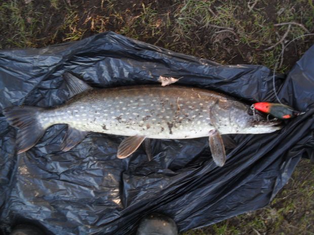 • 1 fish(es) Pike  at 0.7 kg.  "A 50 cm male pike struck at 2:20 p.m. on a slowly reeled in Truttan, the color bright orange. Variable cloudiness, southwesterly wind, water temperature 7+. Other occasional wakes in the shallows, insects on the surface, odd for the time of year."   (  No, released!)