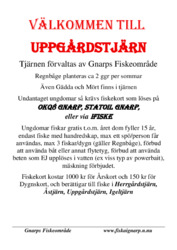 Nya fiskekortsregler gällande Uppgårdstjärn: För fiske här löser du antingen fiskekort "övriga vatten", eller fiskekort "put-/take-vatten". Vi kommer även fortsättningsvis sätta ut Regnbåge här, men detta helt utifrån tillgång och huruvida det är möjligt för fiskbilen att ta sig till tjärnen (vissa leverantörer har stora bilar som inte kan köra dit). Gott om både gädda och mört i tjärnen gör att vi fortsättningsvis tillåter fiske även med fiskekort för "övriga vatten".